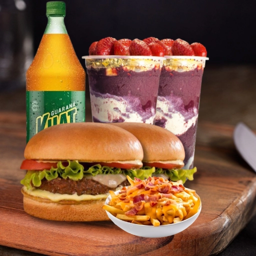 2 hambúrguer simples + 2 açai 200 ml + 300g batata simples + 1 guarana antarctica 1l